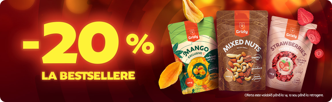 Brum chrum, cele mai delicioase cadouri pentru întreaga familie, gustări exclusive pentru orice vizită și ingrediente de calitate pentru dulciurile parfumate de Crăciun le rezolv eu, Grizly. Acum profitați de o reducere de 20% la aproape 500 de bunătăți. Printre ele se află și ediții limitate de Crăciun, care dispar rapid. 🧡
