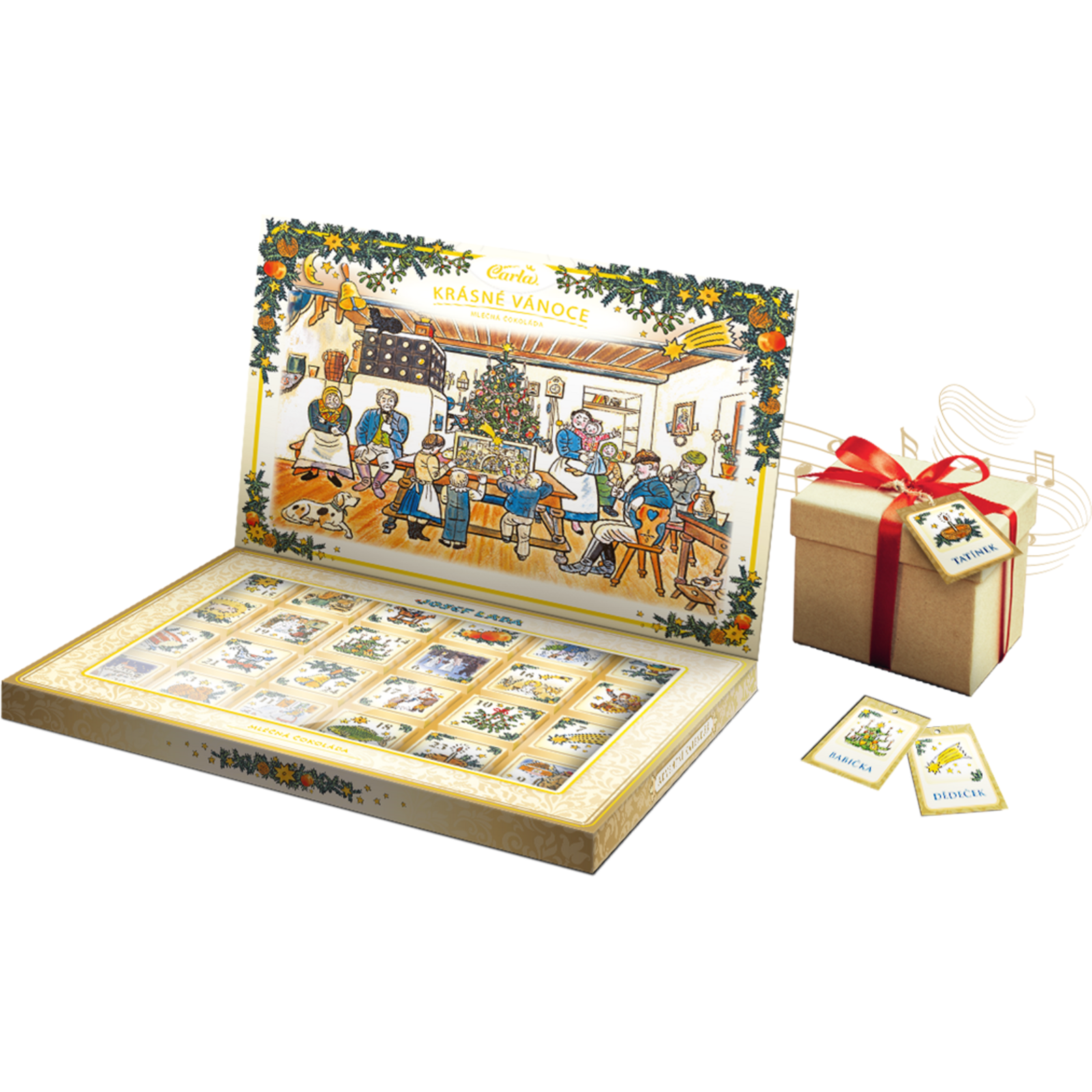 24 de ciocolate cu lapte. Pachetul conține etichete pentru cadourile de Crăciun și, de asemenea, partituri cu versurile celor mai frumoase colinde cehești.