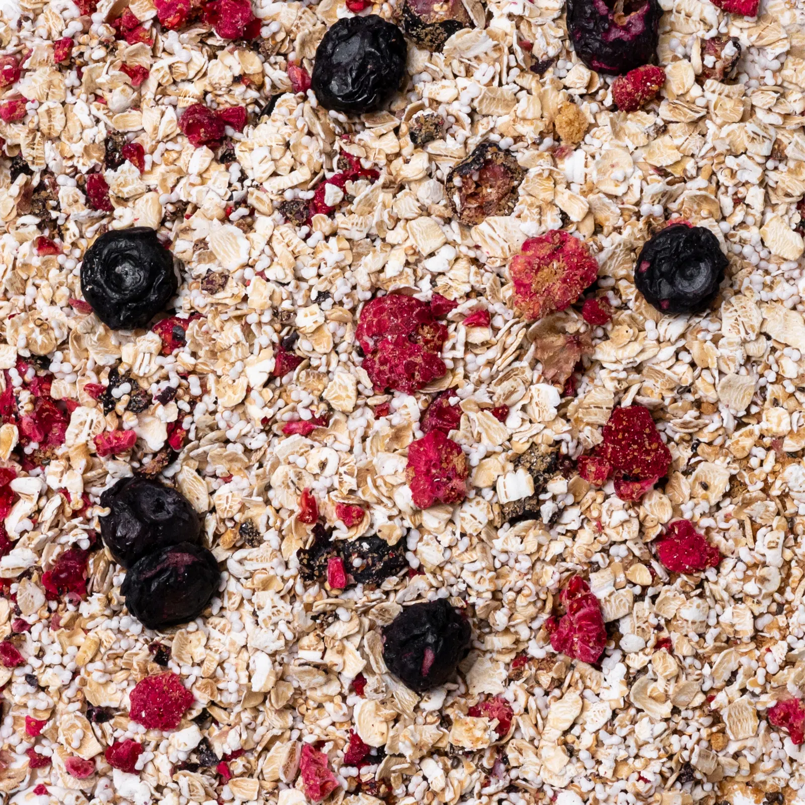 Ca de obicei – din ingrediente bune! Fructe de zmeură și afine deshidratate prin congelare completează fulgii de ovăz fără gluten cu germeni, care sunt mai ușor de digerat decât cerealele normale. În compoziția terciului veți găsi și semințe de chia, amarant puffat și suc de trestie de zahăr deshidratat.