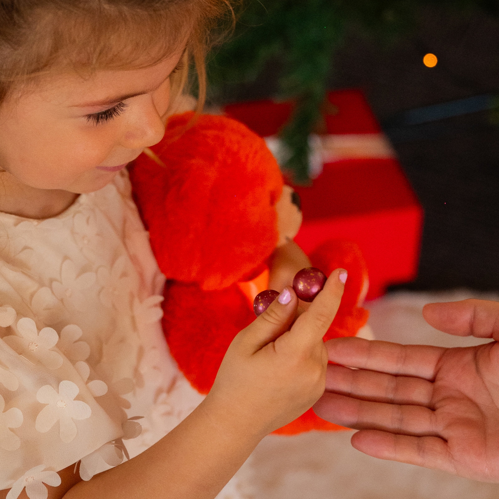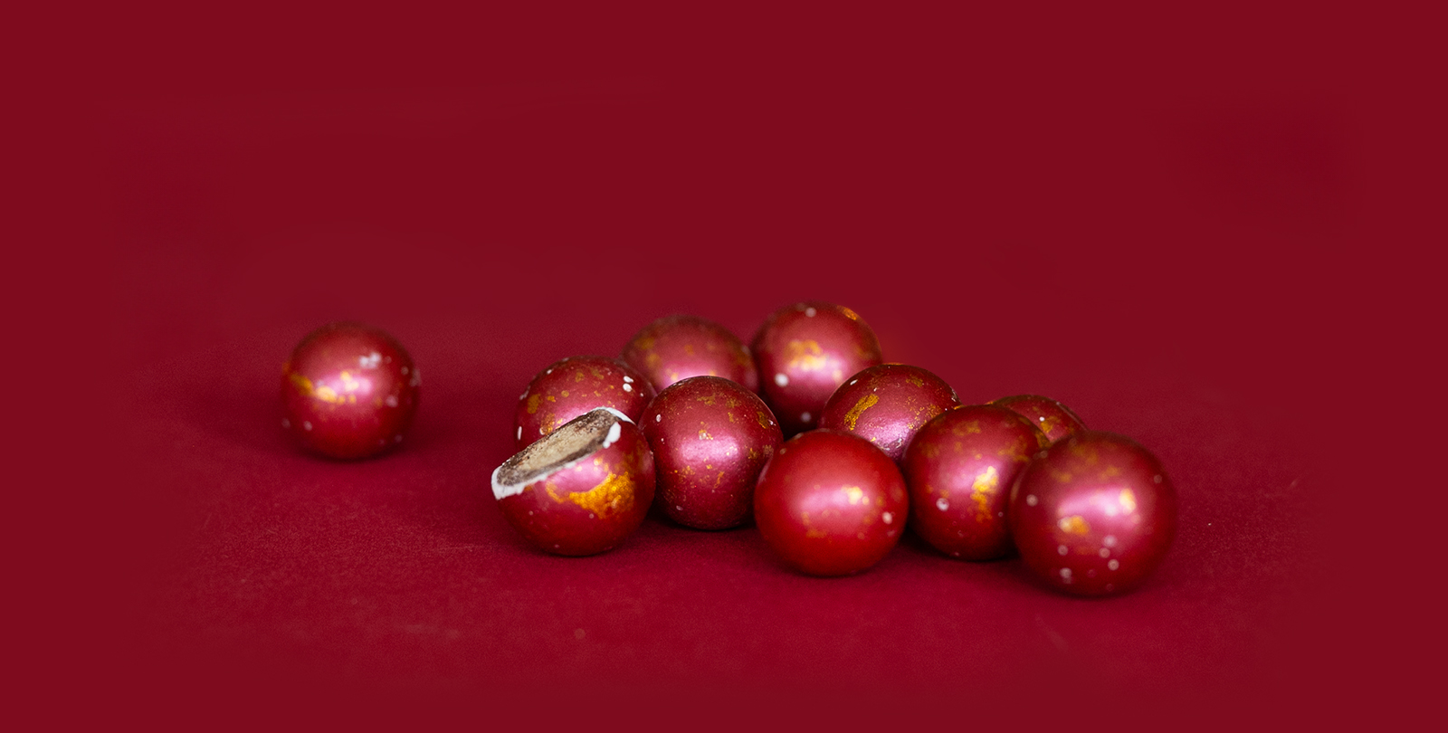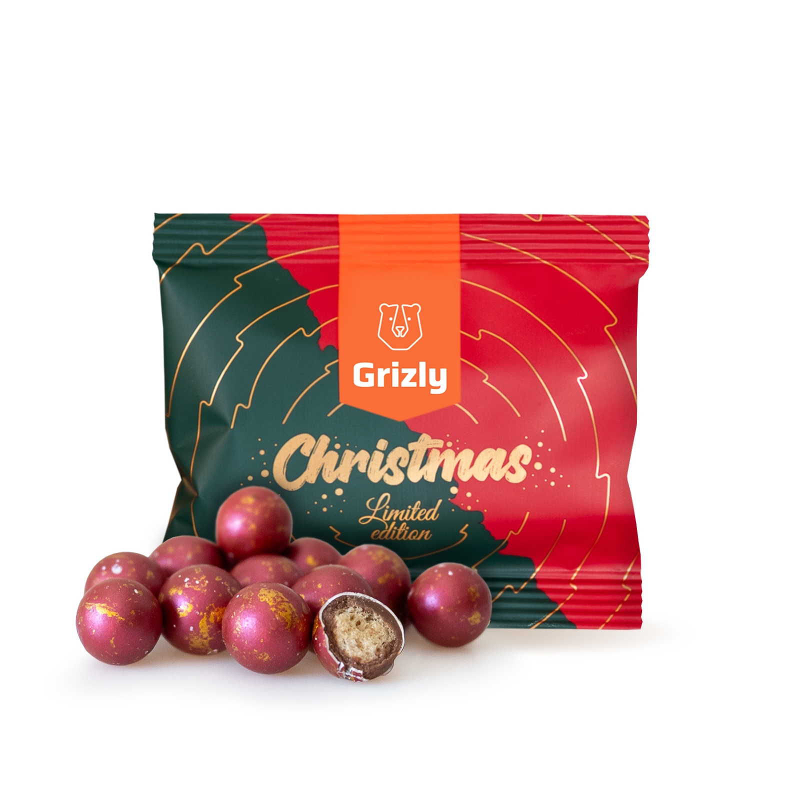 La prima vedere, bilele noastre roșu-aurii par decorațiuni de Crăciun. Și chiar sunt… dar comestibile! Sub aspectul lor festiv și strălucitor se ascund biluțe crocante din cereale, acoperite cu glazură de cacao și o crustă fină de zahăr. Gustul? Exact ca turtă dulce proaspătă. Pentru că sunt ambalate într-un pachet festiv, devin cadoul comestibil perfect. În plus, arată minunat și ca decorațiune pe masa de sărbătoare, iar apoi pot fi savurate ca desert.