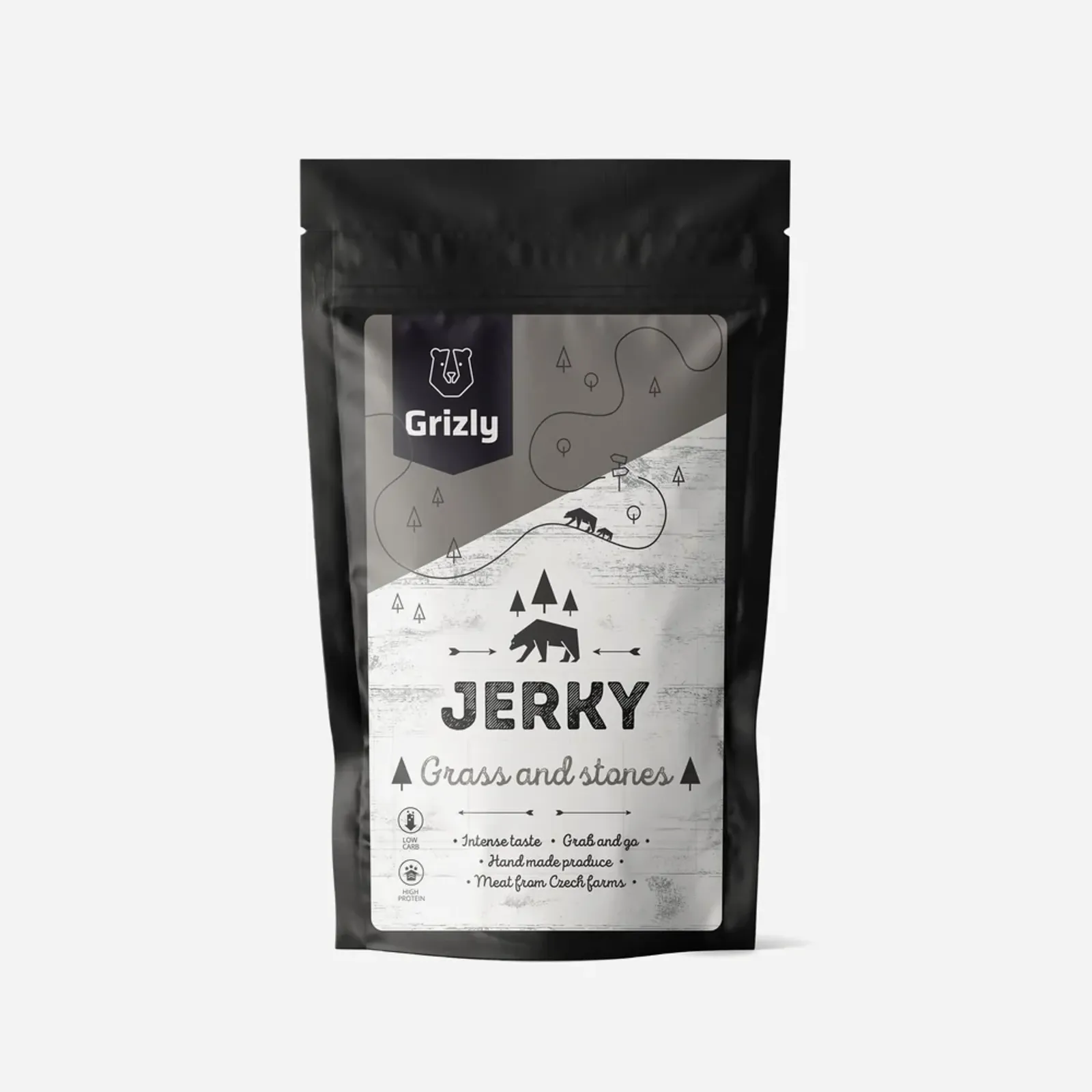 GRIZLY carne uscată, iarbă și pietre, asta este gustarea perfectă plină de proteine și gust original, făcută fără utilizarea substanțelor chimice. Jerky excelent ambalat într-un pachet potrivit pentru călătorii.