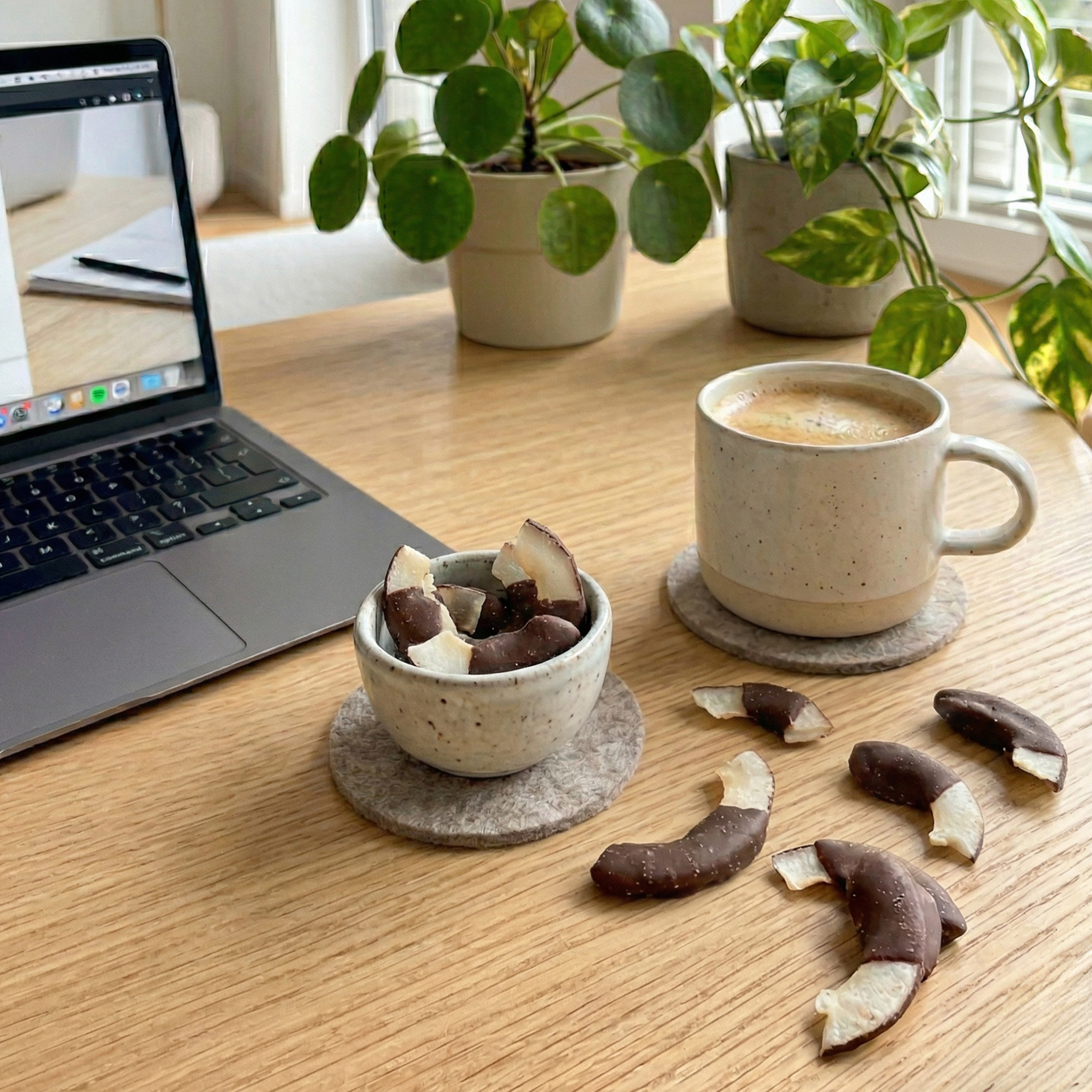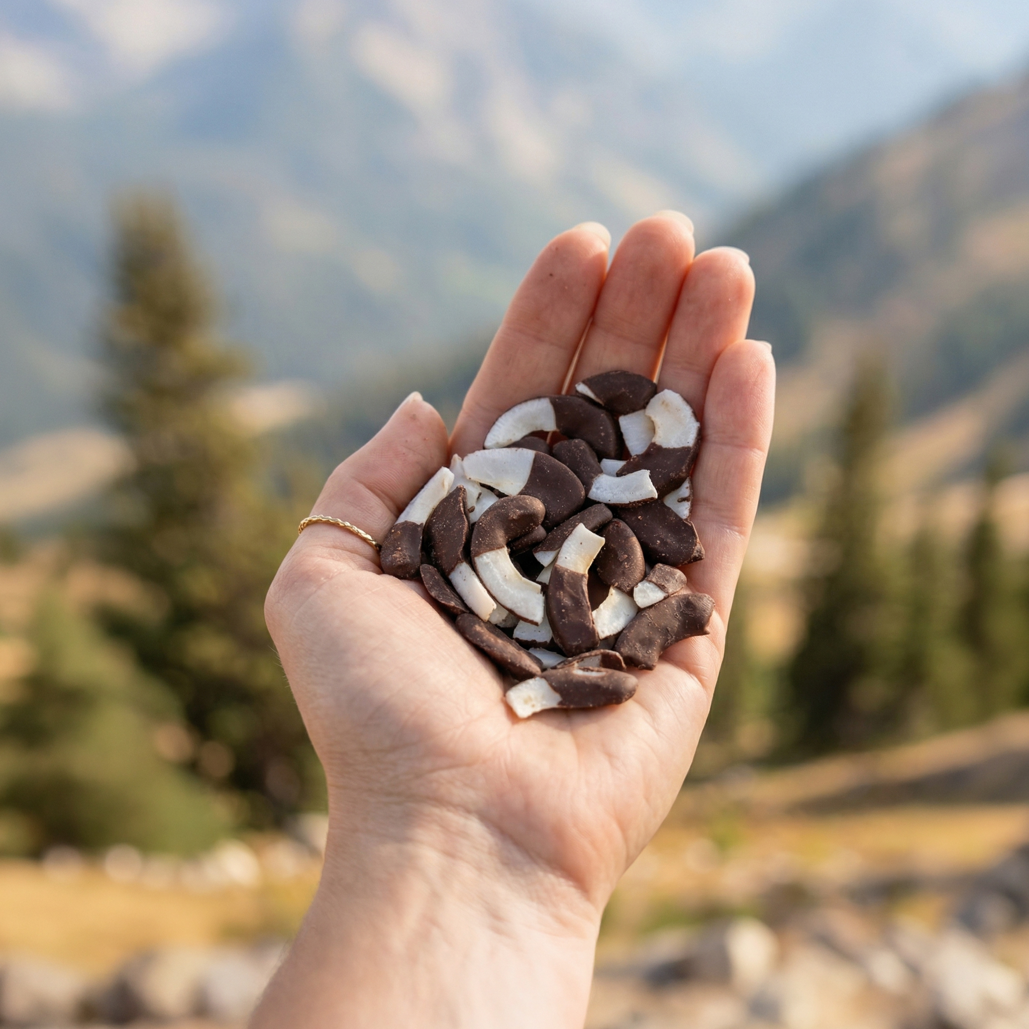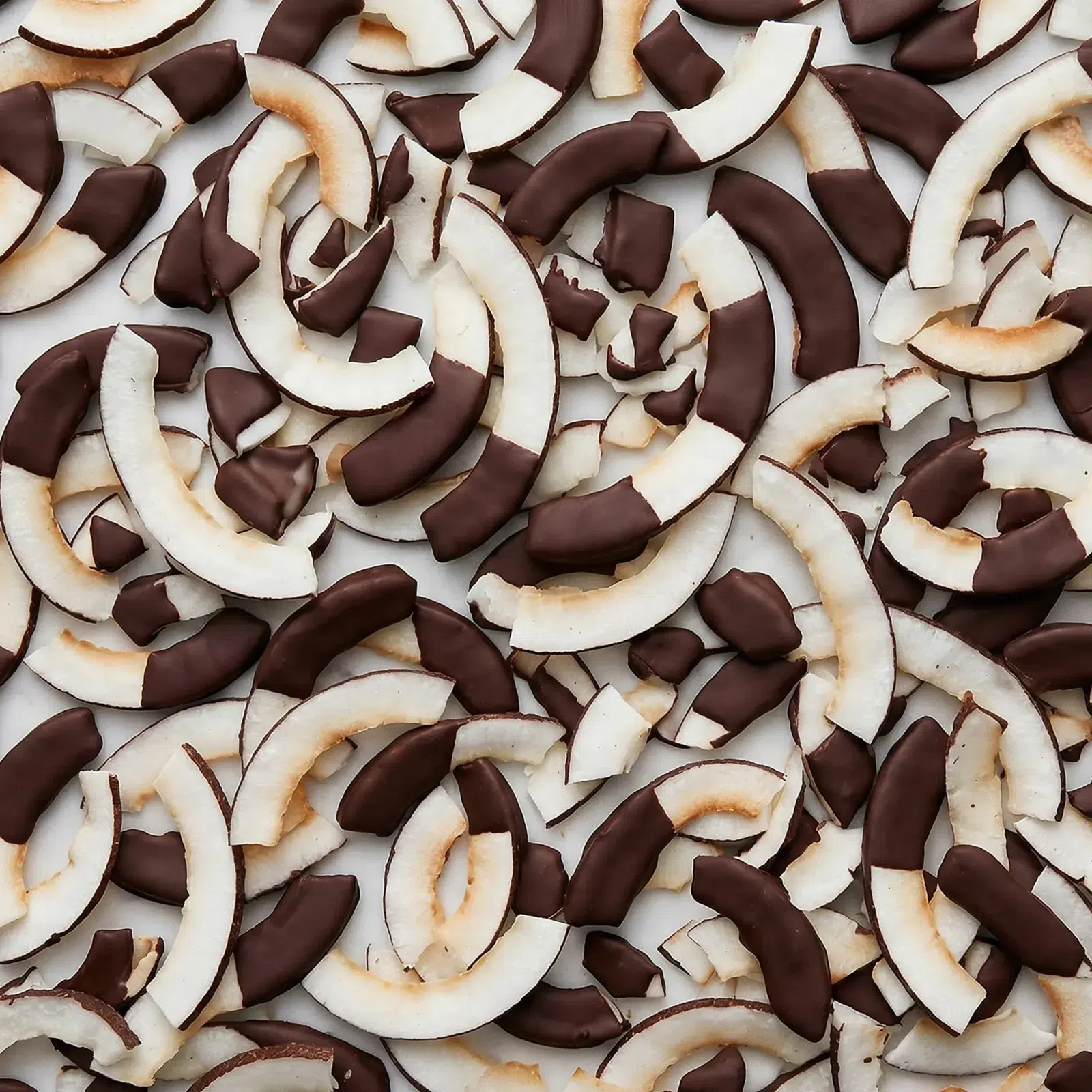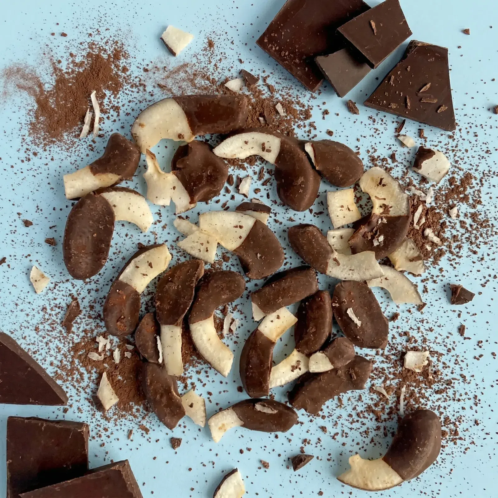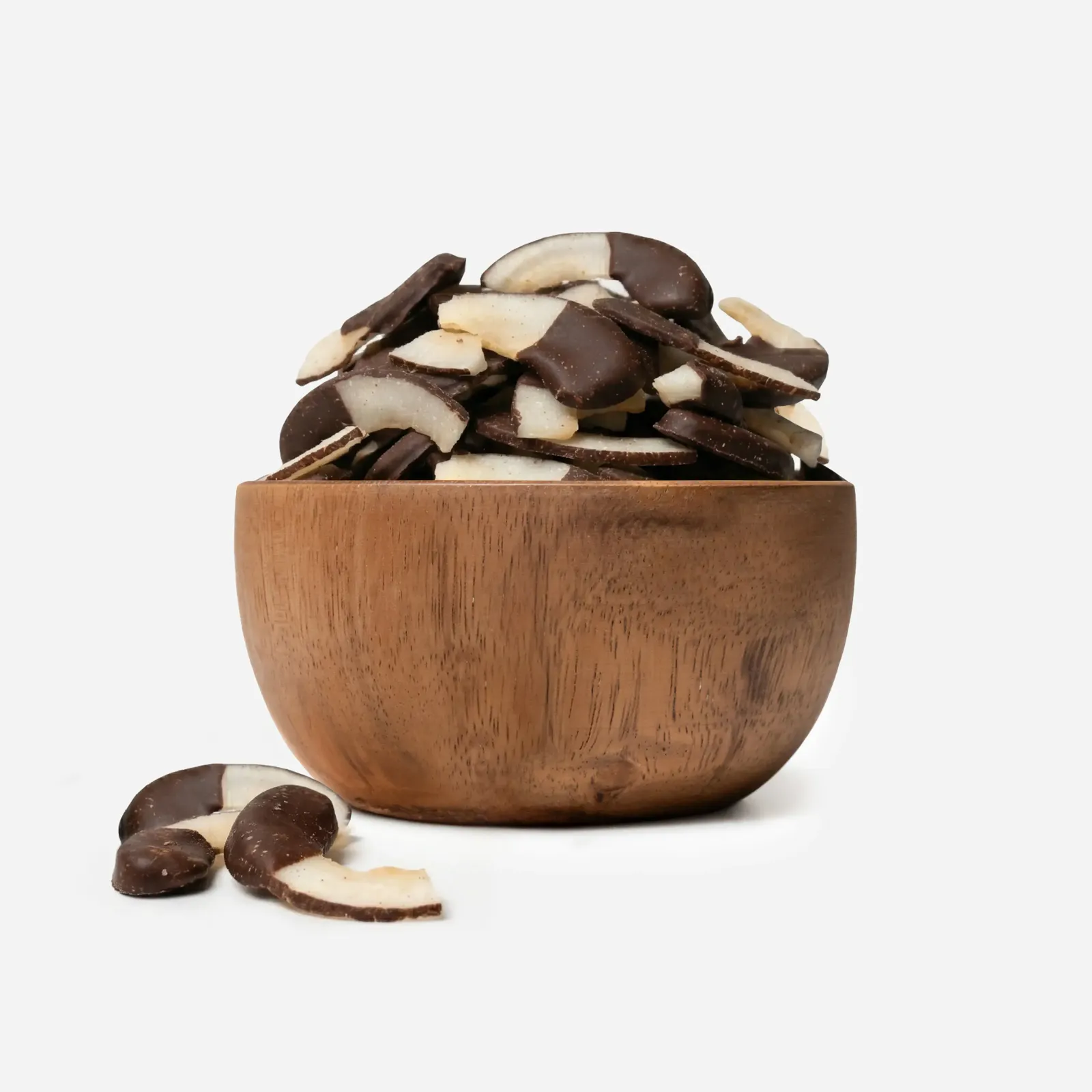 Fulgi crocanți de cocos, pe jumătate înveliți în ciocolată neagră de calitate, fără ulei de palmier. Gustarea ideală pentru poftă sau ca adaos în iaurt ori terci, pentru un plus de crocant. Încearcă-i și ca topping elegant pentru deserturi și înghețată sau ca sursă rapidă de energie în deplasare.