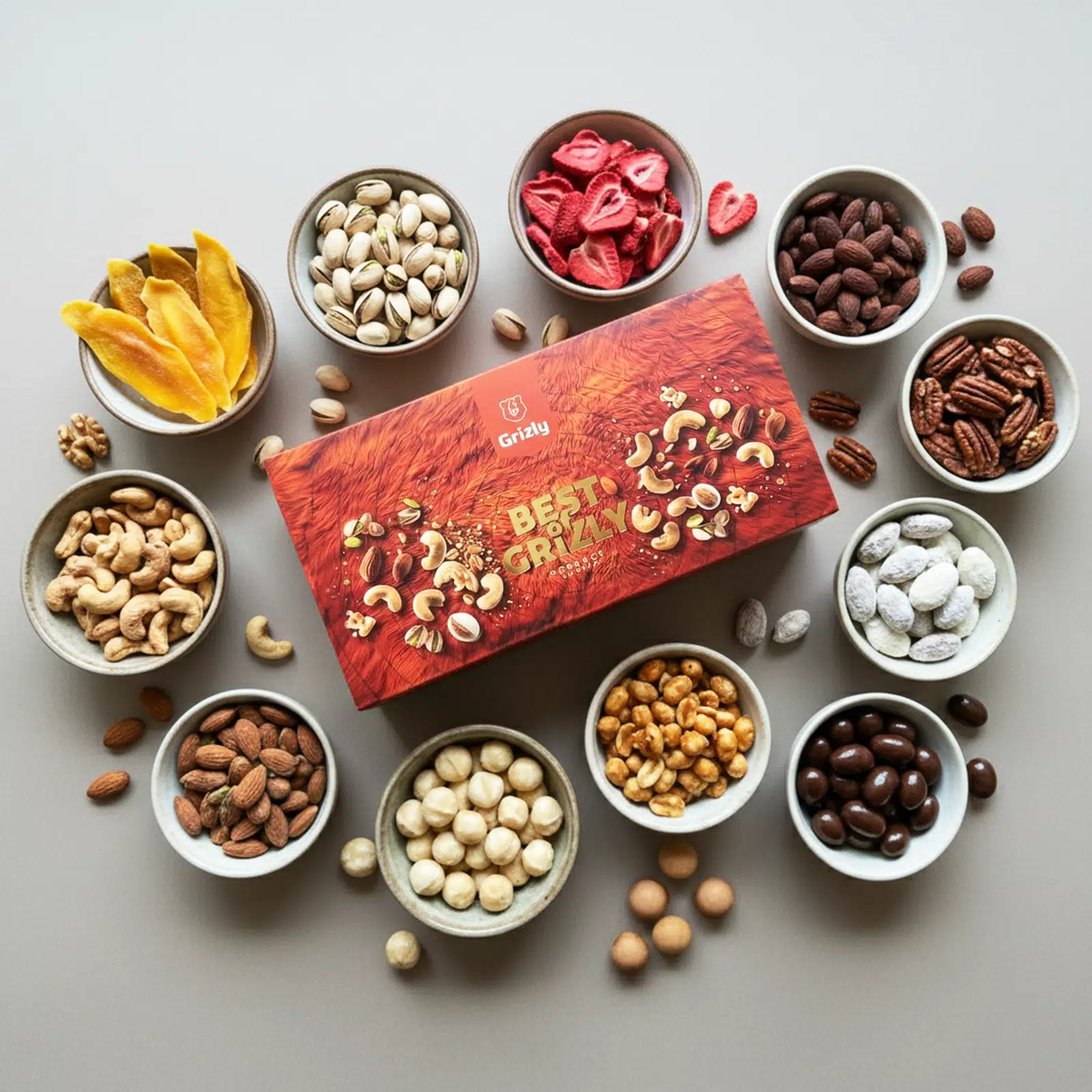 Dulce, sărat, crocant, ușor picant sau dimpotrivă – dulce ca mierea… Este greu să alegi doar o singură gustare. Pentru a te scuti de această alegere dificilă, am pregătit dinainte o selecție a celor mai bune produse. Cutia noastră cadou Best of GRIZLY ascunde cu adevărat tot ce e mai bun.