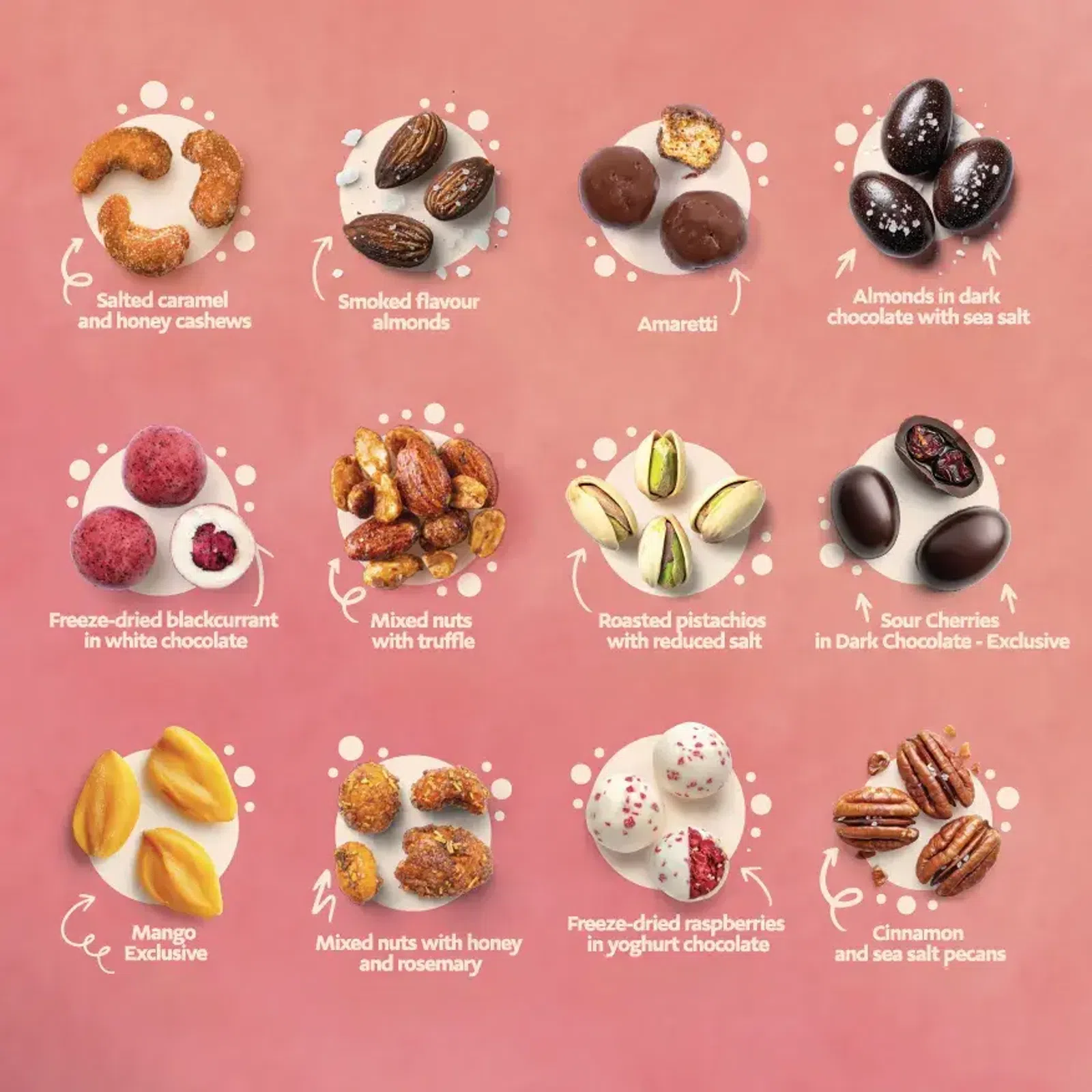 Cutia cadou conține combinații delicioase de caju în caramel sărat, fistic prăjit, migdale cu aromă de fum și alte delicatese. Iubitorii de dulciuri vor fi încântați de vișinele în ciocolată neagră, coacăzele liofilizate în ciocolată sau de biscuiții Amaretti. Combinațiile originale de gusturi sunt completate de nucile pecan cu scorțișoară, mango exclusive și mixul de nuci cu aromă de trufe.