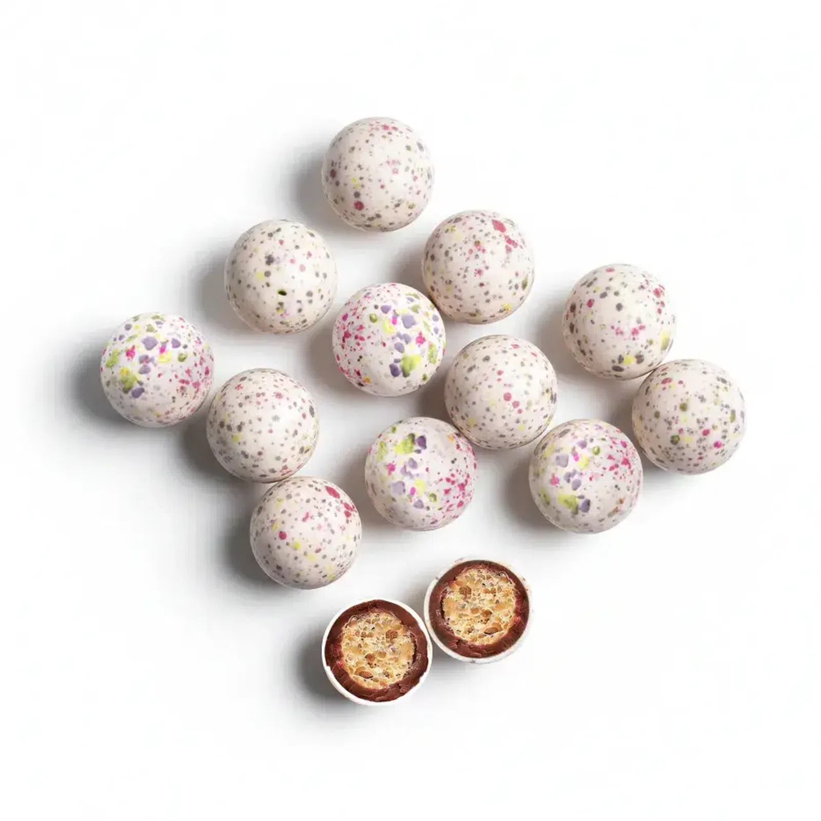 Biluțe mici, pline de primăvară și bucurie. Drajeurile crocante de Paște ascund un miez ușor crocant, învelit într-un strat generos de ciocolată cu lapte și protejat de o coajă fermă de zahăr. Fiecare biluță strălucește în culorile primăverii și oferă o combinație perfect echilibrată între crocant și finețea ciocolatei. Cadoul ideal de Paște pentru colindători, o decorațiune dulce pentru masa festivă sau o bucurie de ronțăit acasă. Pentru că Paștele este cel mai gustos atunci când este colorat și crocant.