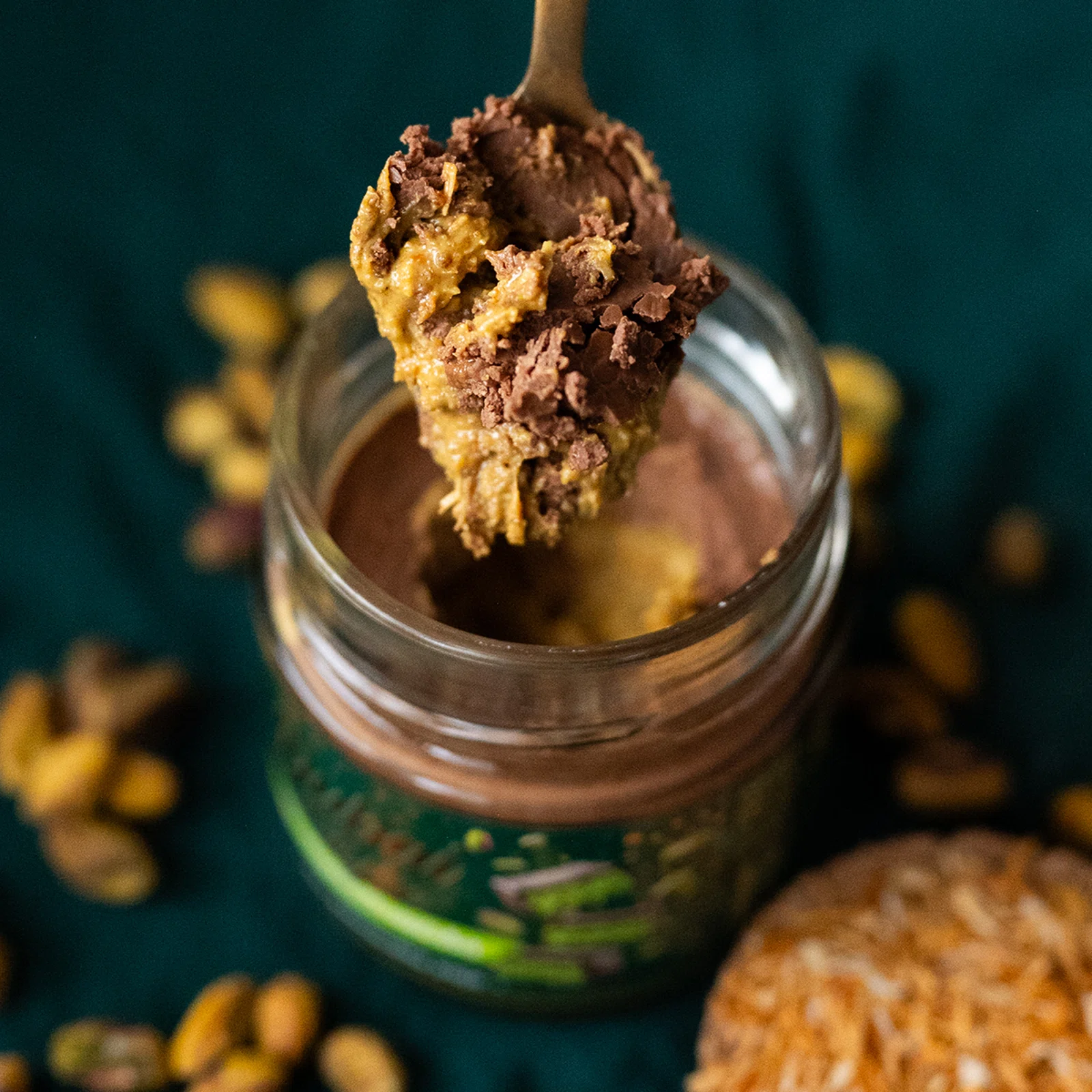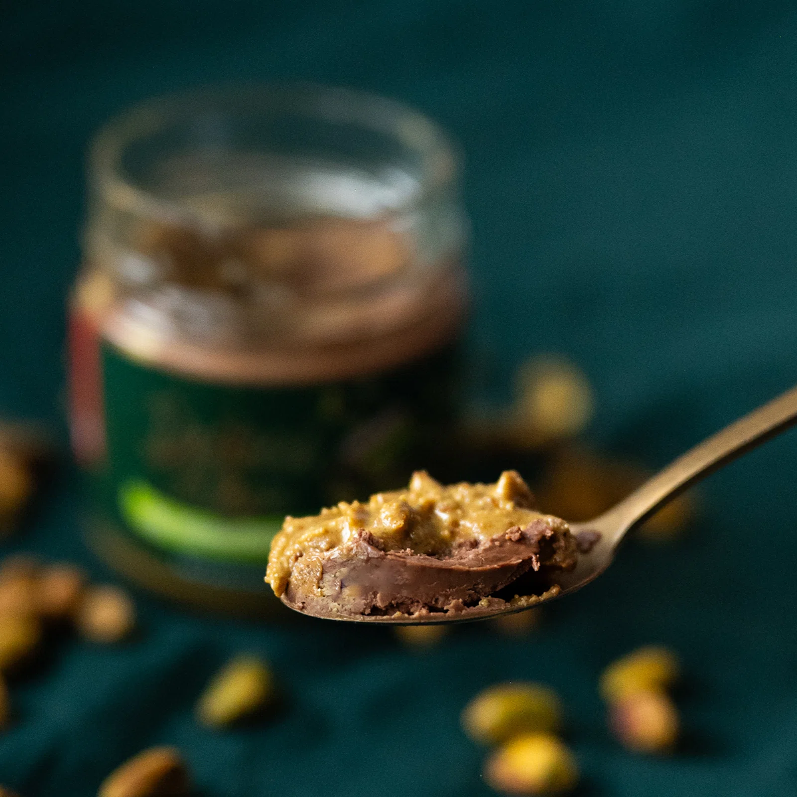 Compoziție: | pistache prăjite 39 %, ciocolată albă belgiană (zahăr, unt de cacao, lapte praf integral lapte, emulgator: lecitină de soia; aromă naturală de vanilie), ciocolată cu lapte Arriba 16 % (zahăr, unt de cacao, lapte praf integral lapte, masă de cacao din Ecuador, lapte praf degresat lapte, emulgator: lecitină de soia; aromă naturală de vanilie), suc de trestie de zahăr uscat, ghí, Kadayifi prăjit 5 % (făină de grâu, apă), tahini (susan).