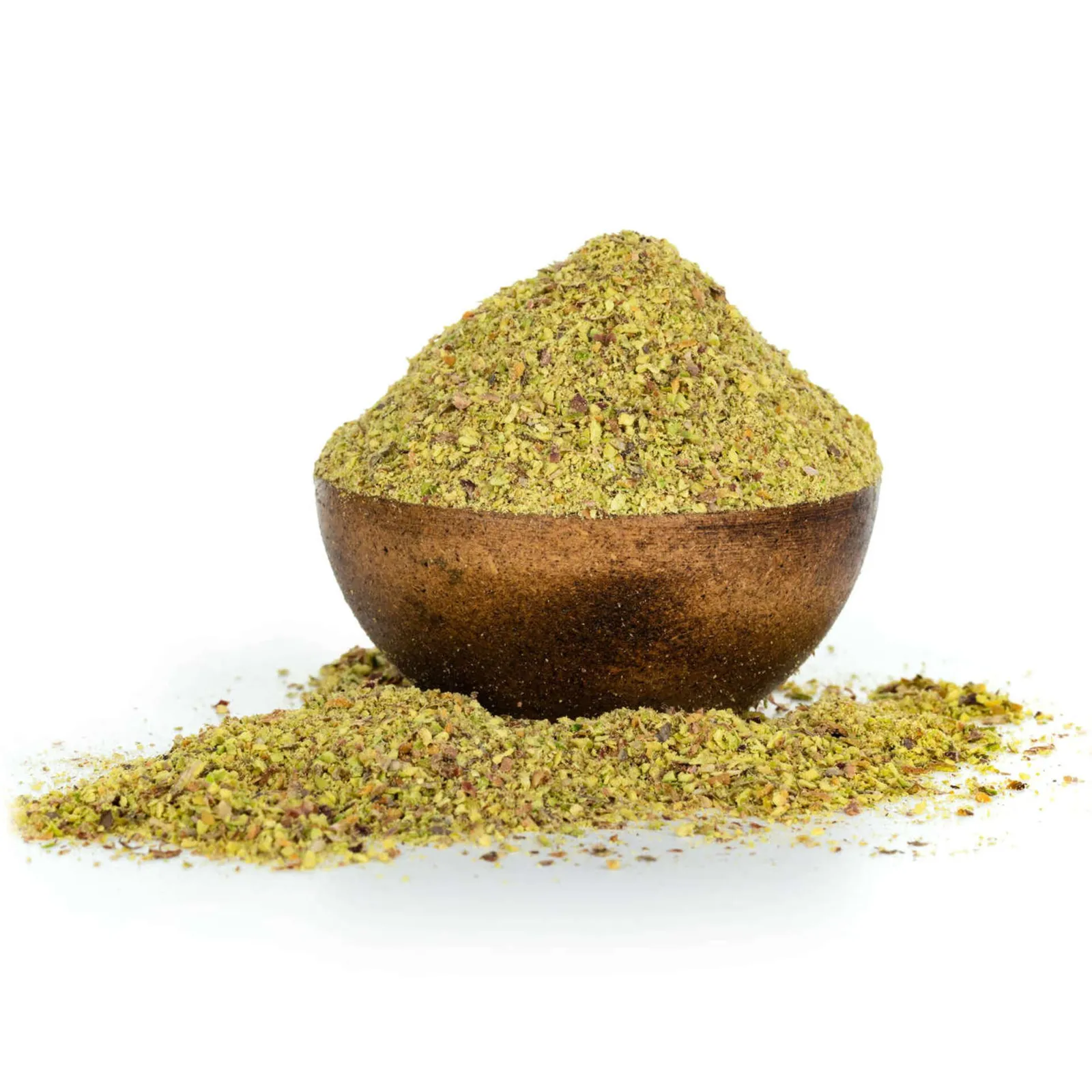 Mălai fără gluten făcut din fistic rumenit are o culoare ușor maro până la verde, cu adaos de galben. Îi conferă prăjiturilor tale un gust și o aromă cu adevărat excepțională.