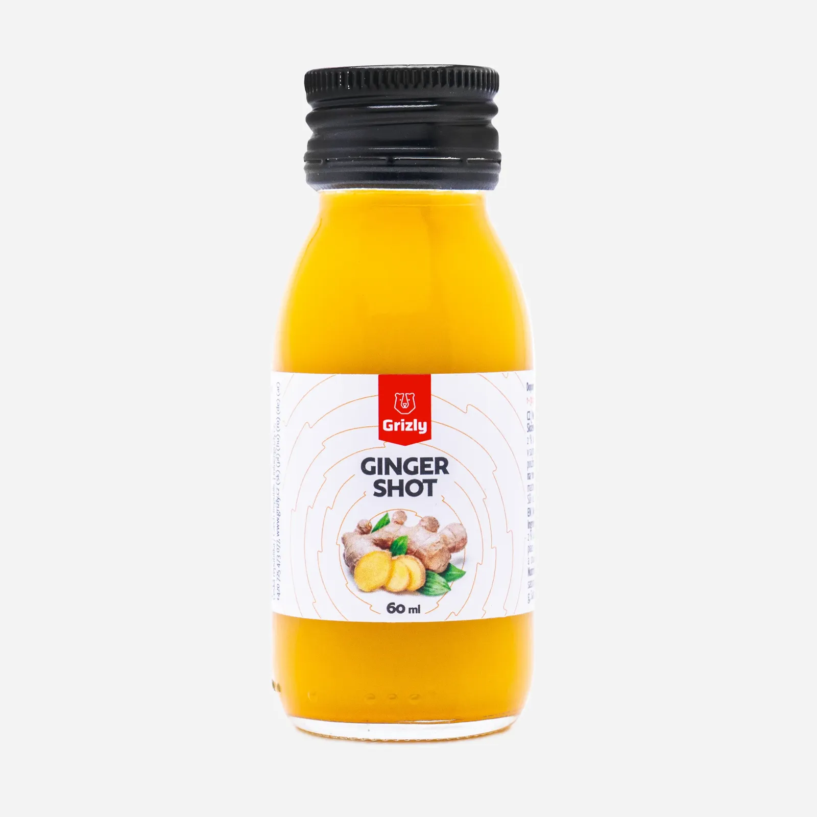 Această băutură chiar impresionează! Și cum! Uită de alcool și mai bine toastează pentru sănătate cu shot-ul nostru de ghimbir, adică o băutură autentică de ghimbir, care te energizează. Baza sa este aproape 60% suc de ghimbir autentic, completat cu turmeric, suc de lămâie, piper Kampot și miere – doar lucruri bune. Shot-ul de ghimbir te va surprinde plăcut cu gustul său ușor picant, echilibrat prin adăugarea apei de cocos.