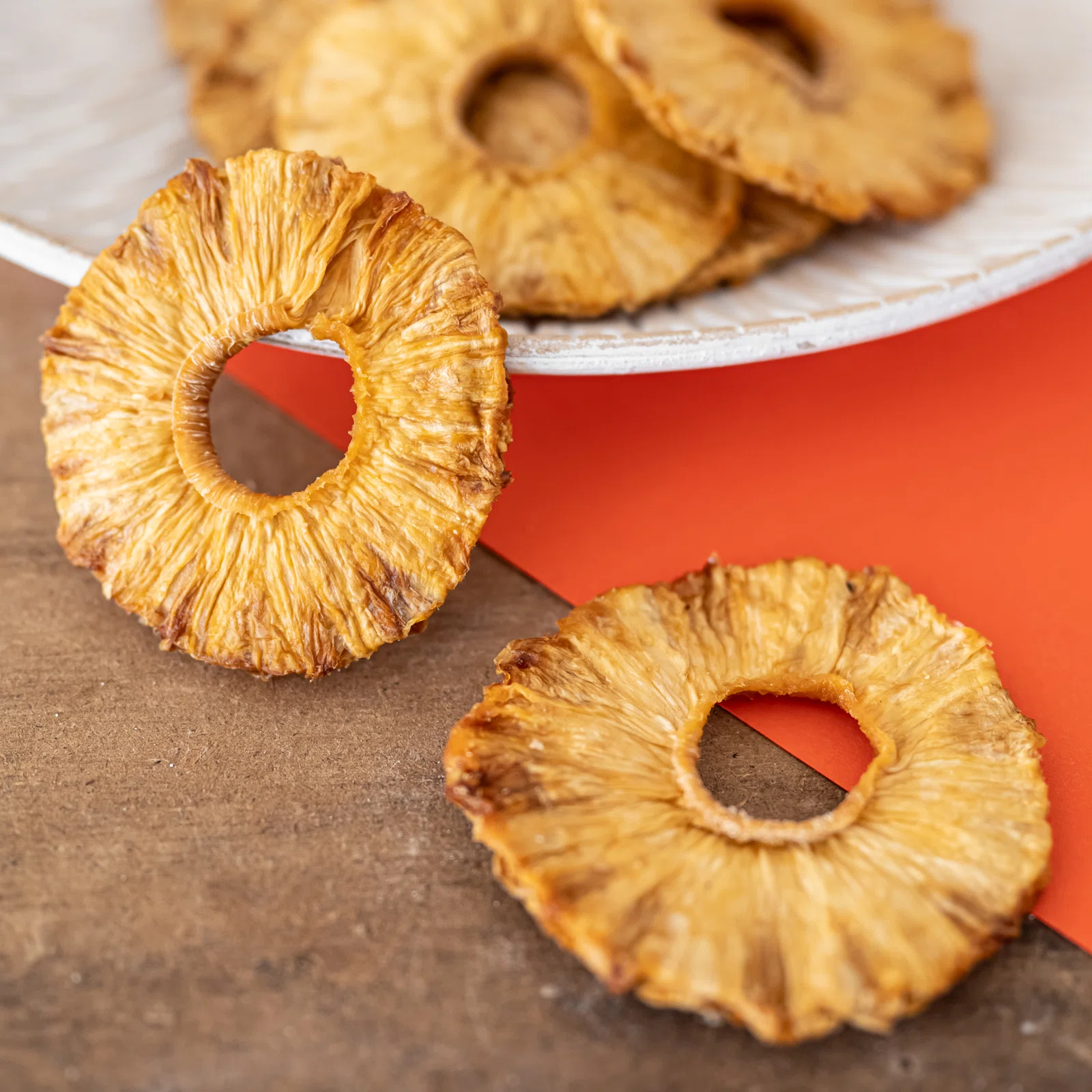 Te vei îndrăgosti imediat de rondelele dulci de ananas. Și așteaptă până când vei descoperi, ce gust au! Atunci cu siguranță nu vei mai vrea să renunți la ele. Nu-ți face griji, nici nu trebuie, pentru că rondelele de ananas uscate sunt 100% naturale. În compoziția lor nu vei găsi zahăr adăugat, sulfiți sau aditivi. Odată ce muști dintr-o felie, vei simți pe limbă pulpa moale și dulce și vei fi prinsă – într-o minunată capcană de ananas. De ce nu? Pe lângă gustarea simplă, le poți folosi ca decor pentru terciul de dimineață, iaurt sau müsli. Sunt de asemenea o gustare rapidă și practică, perfectă pentru muncă, școală sau excursii.