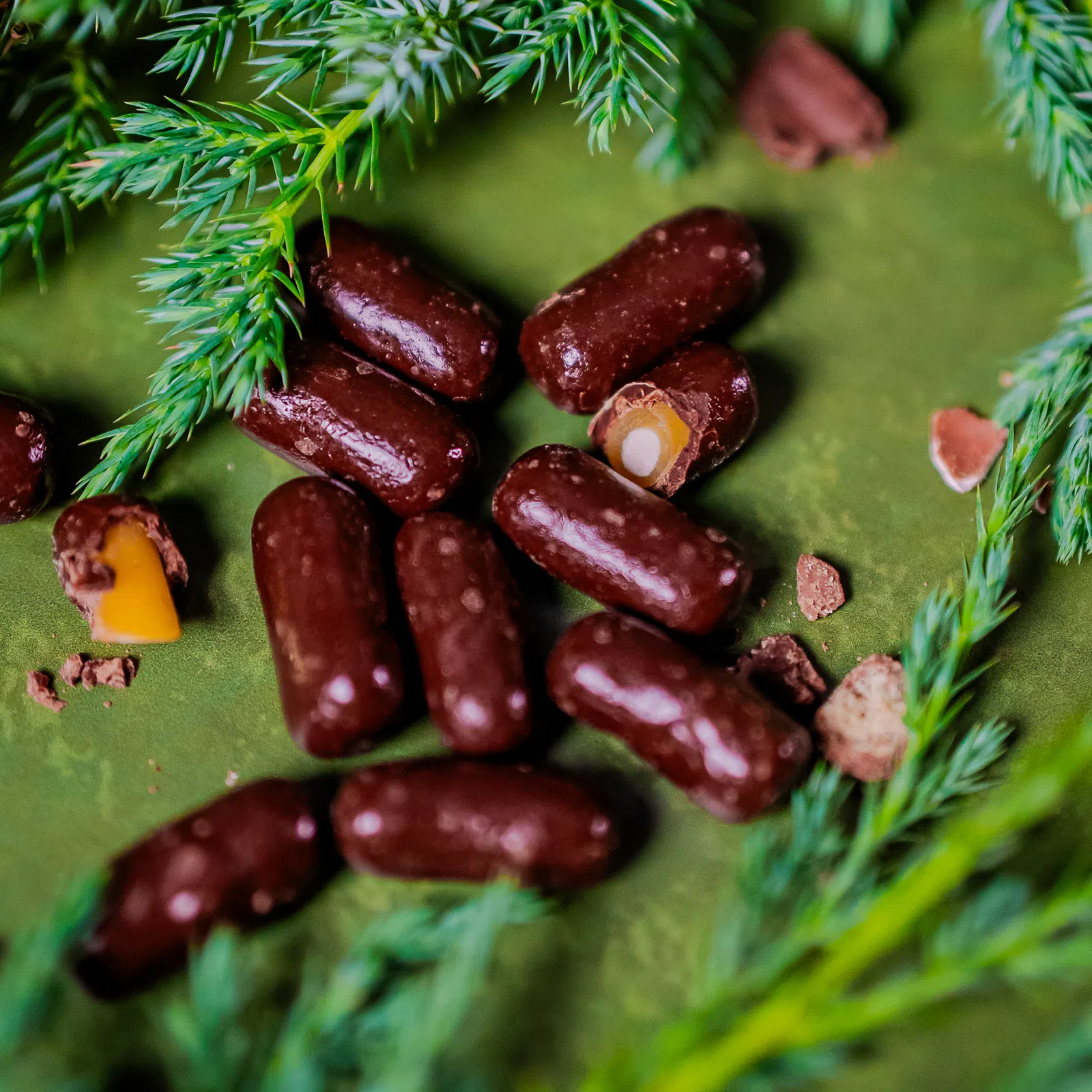 Dacă în copilărie adorai jeleurile, bomboanele și alte dulciuri, aceste pendrek-uri te vor cuceri de la prima mușcătură. Sunt o combinație rafinată între ciocolata amăruie și aroma intensă de piersică. Odată ce deschizi ambalajul festiv de Crăciun, vei fi cucerit de gustul lor delicios. Îți garantăm că vor dispărea rapid, așa că îți recomandăm să comanzi mai multe pachete. Le poți combina și cu pendrek-urile de piersică în ciocolată albă, disponibile tot la GRIZLY.