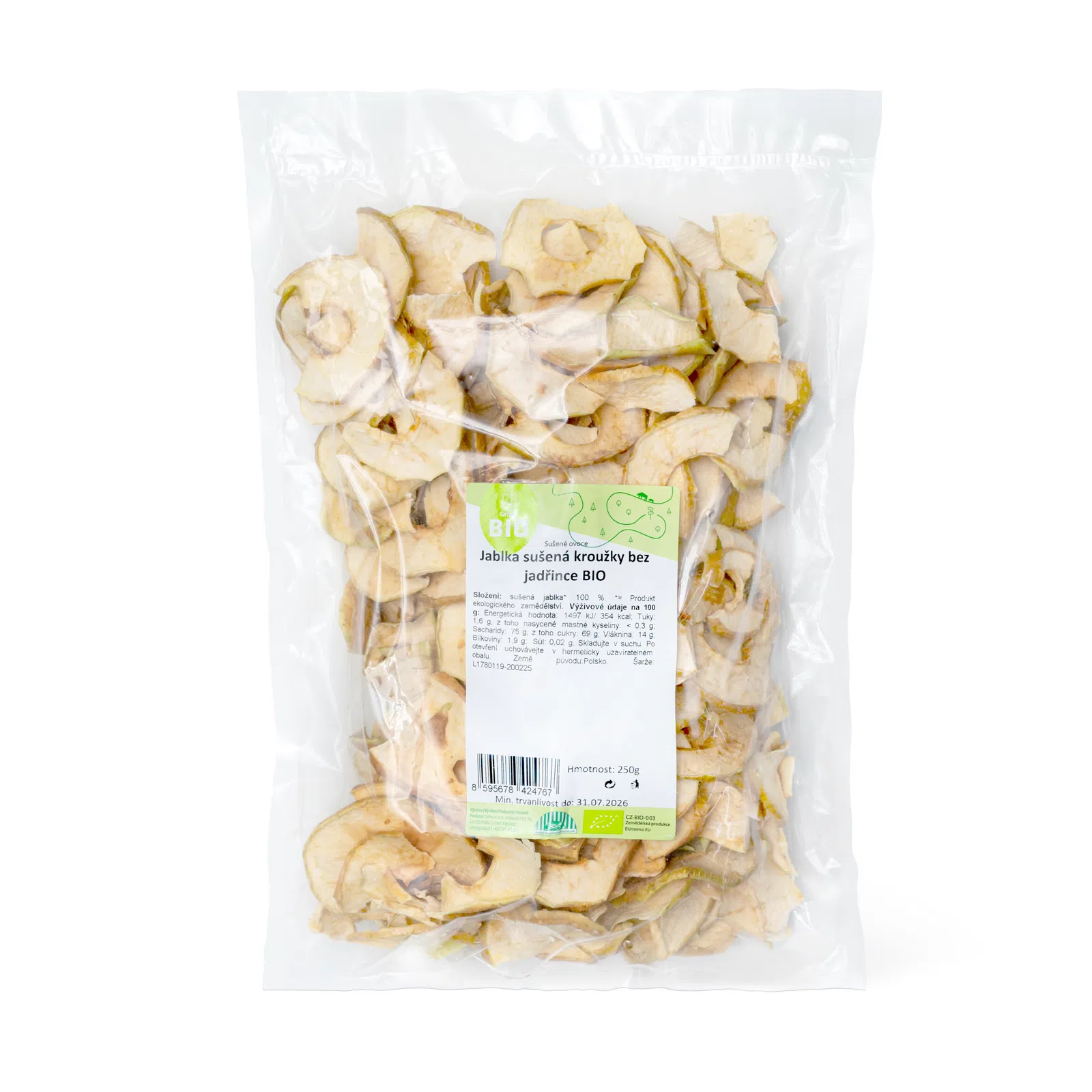 Descoperiți gustul delicios al rondelelor de mere uscate în calitate BIO! Merele noastre uscate sunt produse din fructe atent selecționate, complet coapte, provenite din agricultură ecologică. Sunt uscate delicat cu aer cald, ceea ce le permite să-și păstreze dulceața naturală, aroma plăcută și consistența moale. Nu conțin zahăr adăugat sau alte ingrediente – doar gustul autentic al merelor. Merele uscate BIO sunt o alegere excelentă pentru o gustare sănătoasă și o opțiune practică pentru călătorii. Adăugați-le în granola de casă, müsli, terci de ovăz sau propriul amestec de nuci și fructe uscate. De asemenea, sunt ideale pentru coacere și prepararea deserturilor.