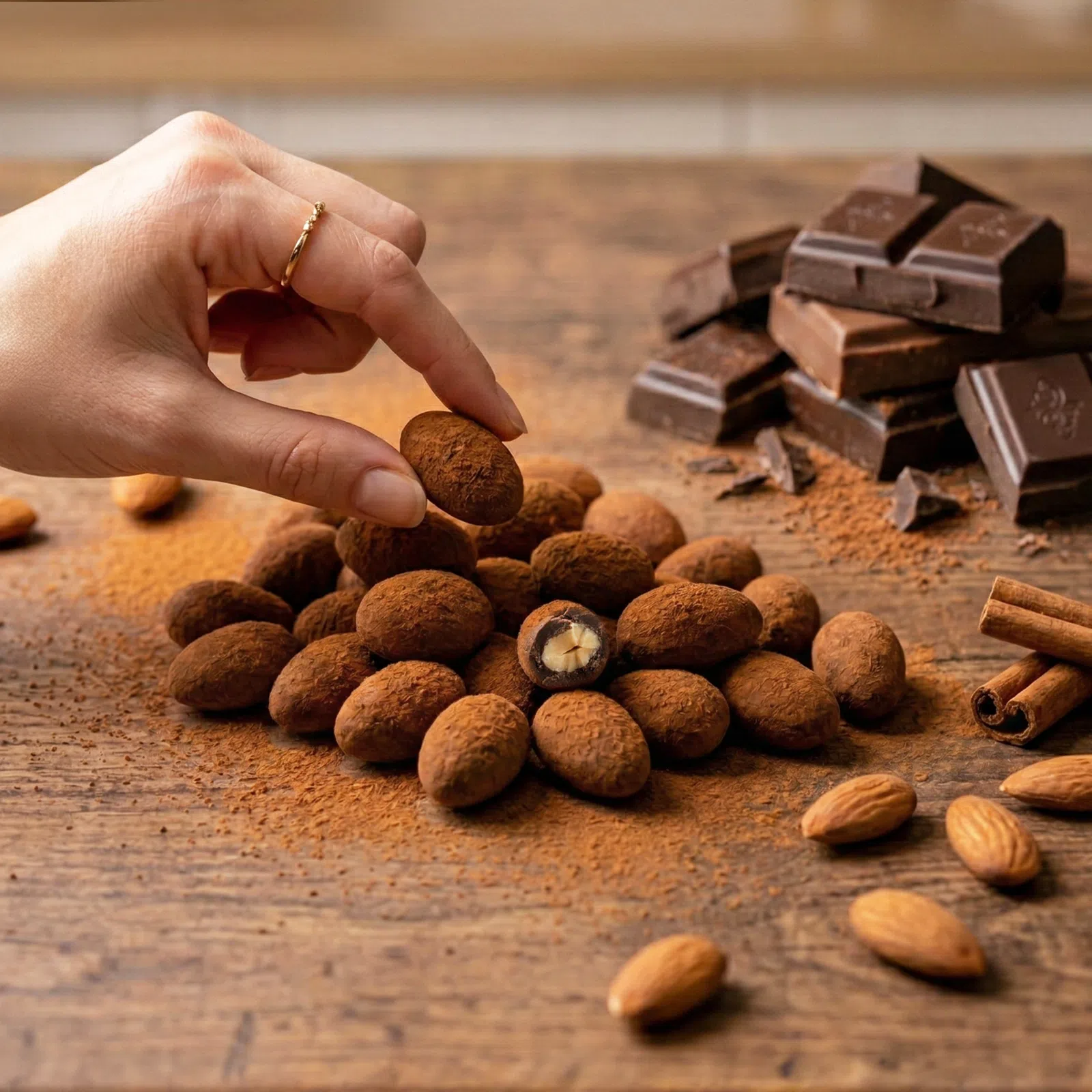 | Ingrediente: | ciocolată cu lapte 67% (zahăr, lapte integral praf, masă de cacao, unt de cacao, zer praf, aromă naturală de vanilie, emulgator: lecitină de soia); migdale 30% (migdale, ulei de floarea-soarelui), scorțișoară 2%, sirop de glucoză, dextrină din tapioca, agent de glazurare: gumă arabică. |