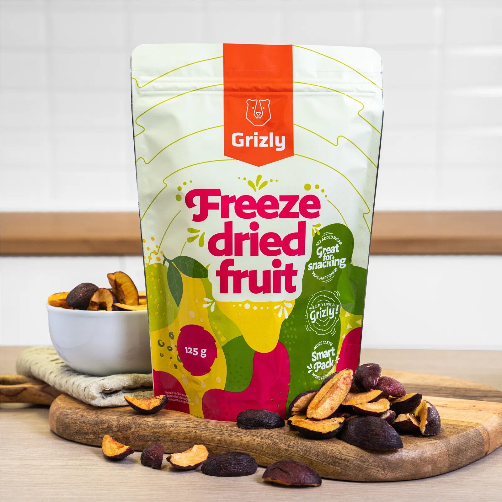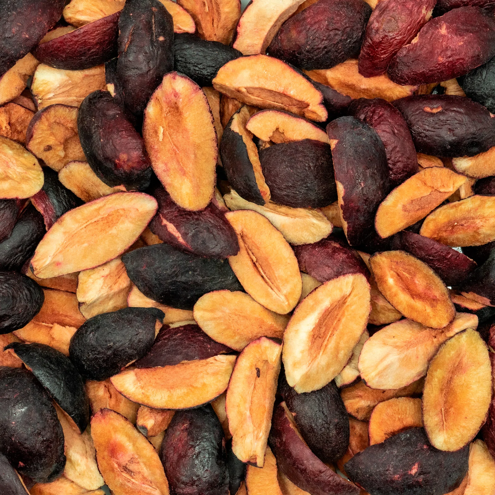 Prunele uscate prin congelare sunt fabricate din fructe întregi, coapte și atent selectate. Sunt crocante, cu un gust minunat. Sunt potrivite ca snack-uri, pentru a decora terciul de dimineață sau puteți adăuga în iaurt sau granola de casă. Încercați să le utilizați și în timpul gătitului sau coptului. Prunele sunt bogate în vitamine, minerale și fibre. De asemenea, conțin sorbitol, care funcționează similar cu fibrele la nivelul intestinelor. Pectinele conținute încetinesc absorbția zaharurilor și accelerază arderea grăsimilor.