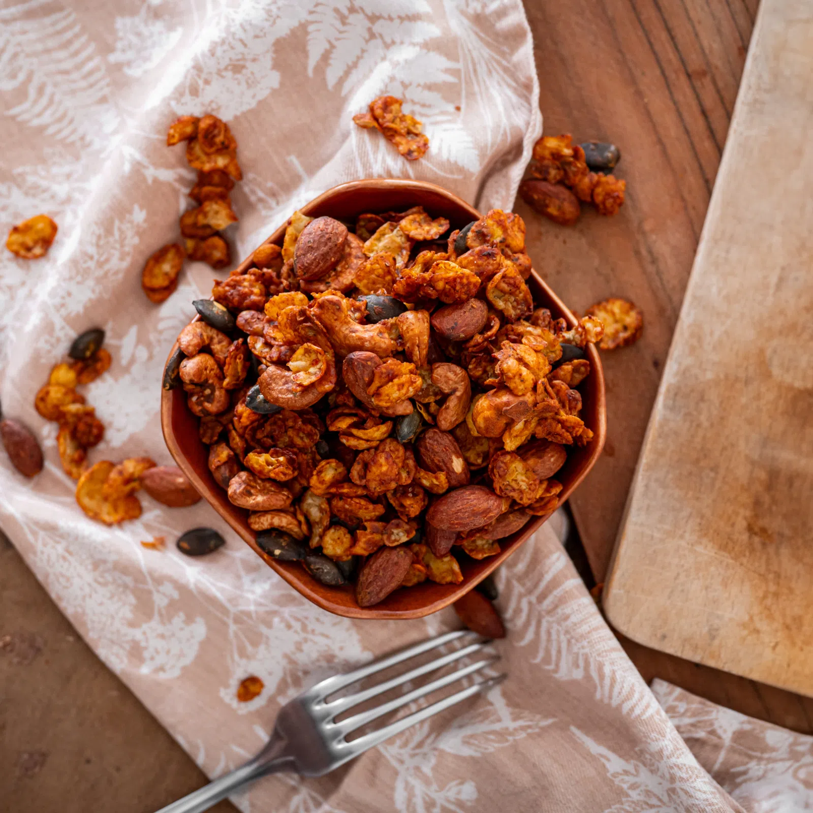 | Ingrediente: | fulgi de porumb 33 % (porumb 99 %, sare de mare), nuci caju 22 %, migdale naturale 20 %, semințe de dovleac, ulei de măsline, drojdie uscată, albuș de ou uscat, sare de mare afumată 2 %, boia dulce afumată, amestec de condimente (morcovi, roșii, păstârnac, ciuperci, ceapă, muștar, cimbru de grădină, schinduf albastru, schinduf, foi de dafin, sare afumată 5 %, alge nori). |
