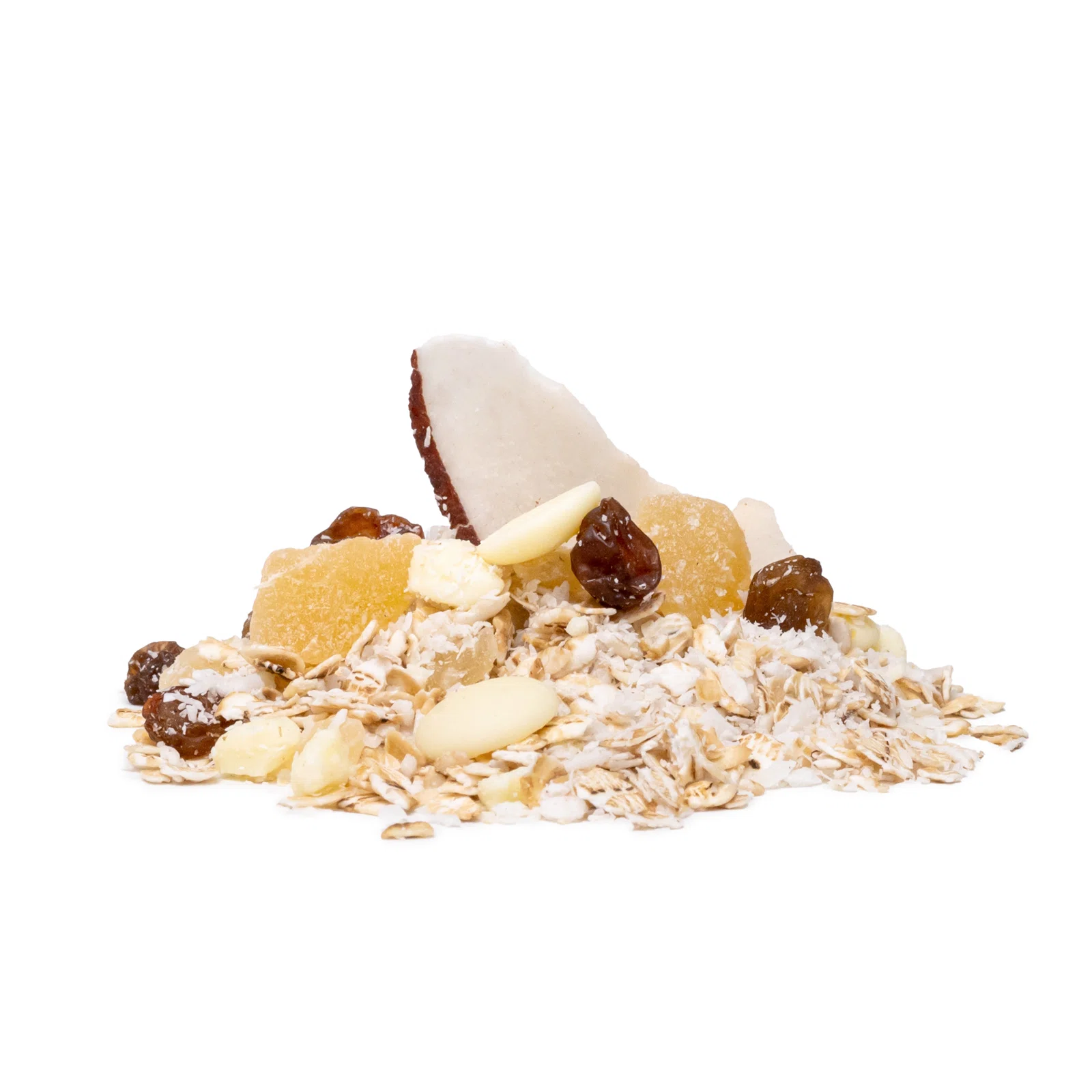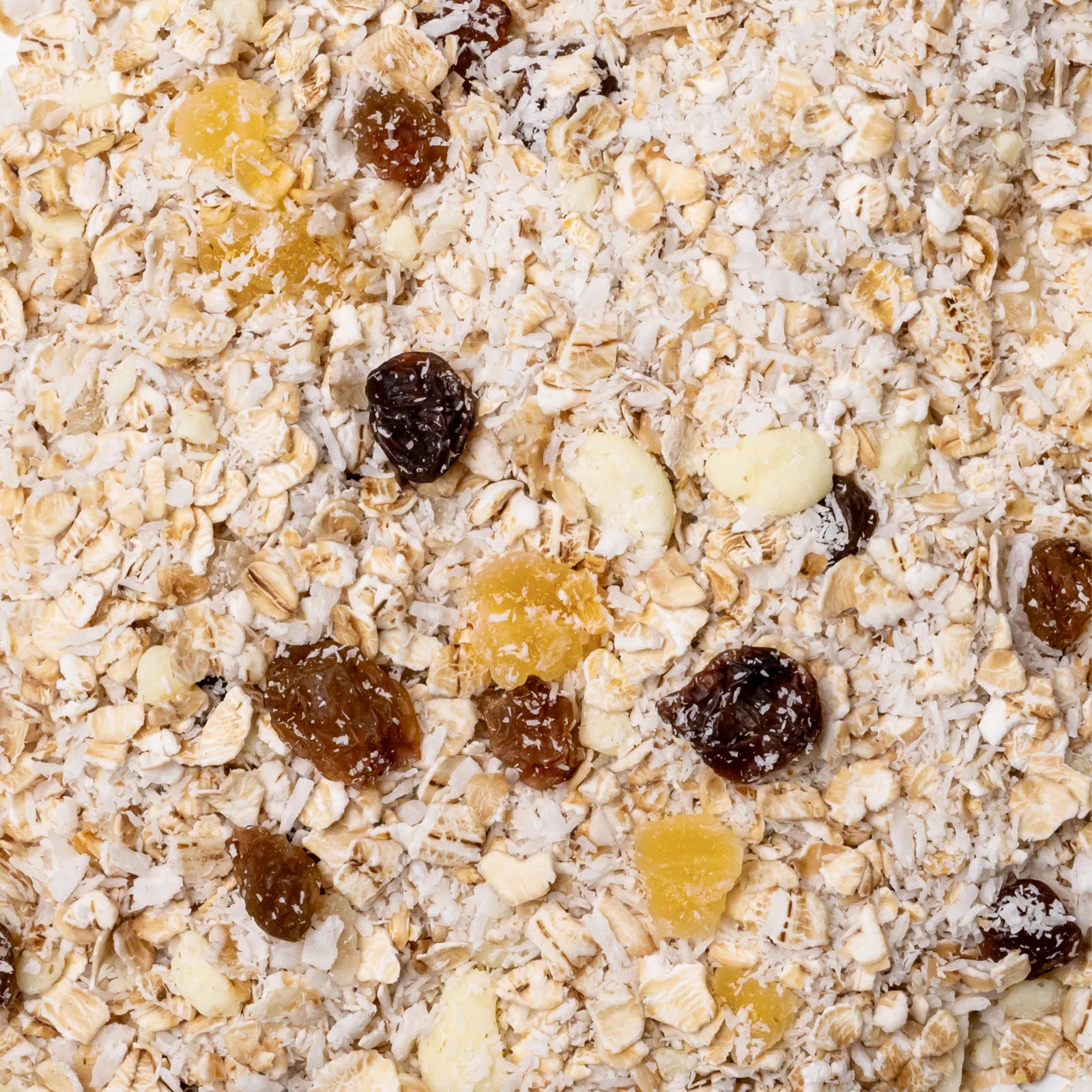 | Ingrediente: | fulgi de ovăz fără gluten cu germeni 38 %, nucă de cocos rasă 25 %, ciocolată albă belgiană (zahăr, unt de cacao, lapte praf, emulgator: lecitină de soia; aromă naturală de vanilie), stafide aurii (stafide 99,7 %, ulei de floarea-soarelui), cuburi de ananas 8 % (ananas 51 %, zahăr, regulator de aciditate: acid citric; conservant: dioxid de sulf). |